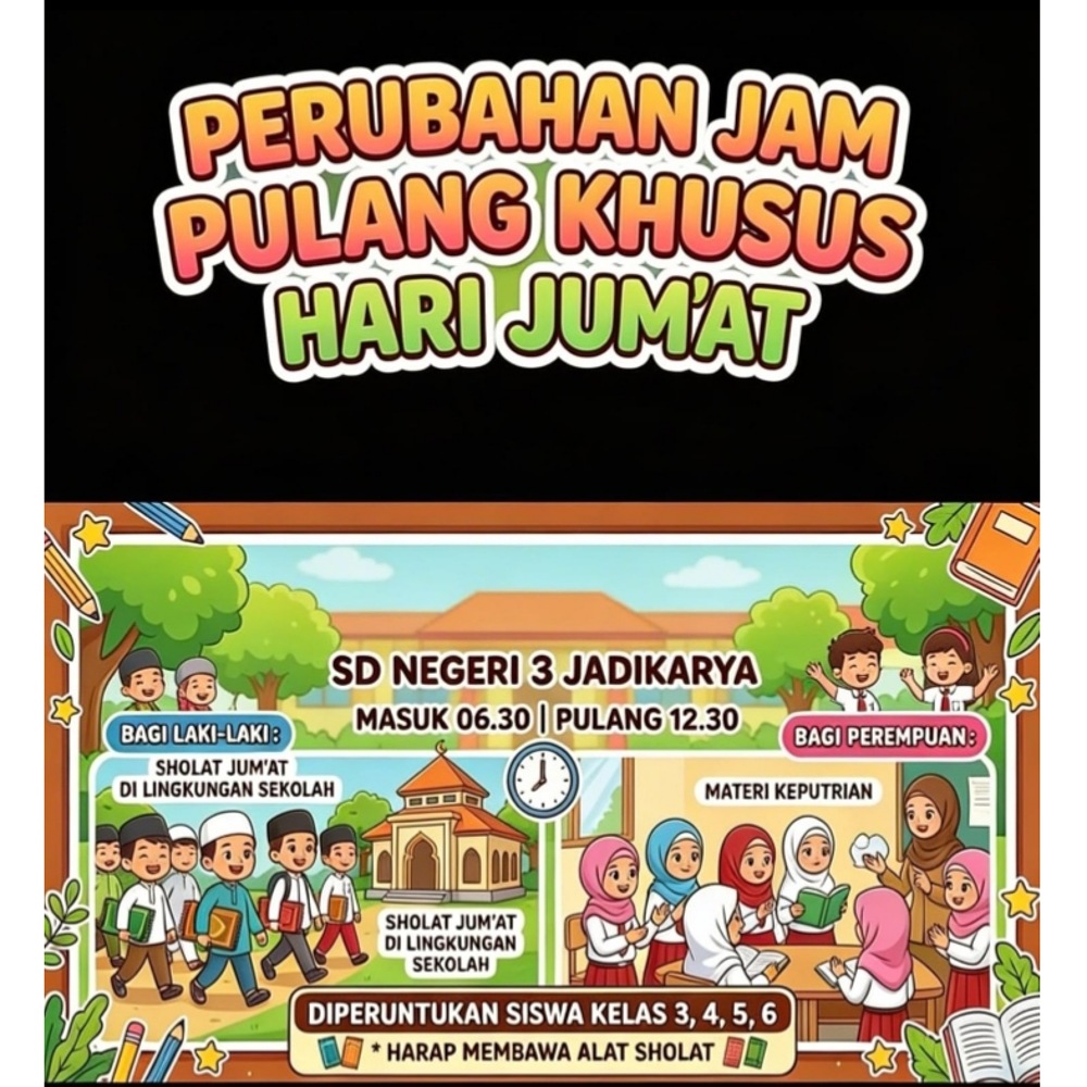 Dalam rangka upaya menanamkan nilai-nilai keagamaan dan pembiasaan sejak dini seperti masuk Sekolah jam 06:30 dan pulang 12:30. Tak hanya itu SDN 3 Jadikarya, Kecamatan Langkaplancar, Kabupaten Pangandaran pun menggelar kegiatan Sholat Jum’at bareng siswa kelas 3, 4, 5, dan 6, di lingkungan Sekolah. Yang dilaksanakan setiap hari Jumat. Kegiatan ini merupakan bagian dari implementasi program yang dicanangkan oleh Dinas Pendidikan, Pemuda, dan Olahraga (Disdikpora) Kabupaten Pangandaran.